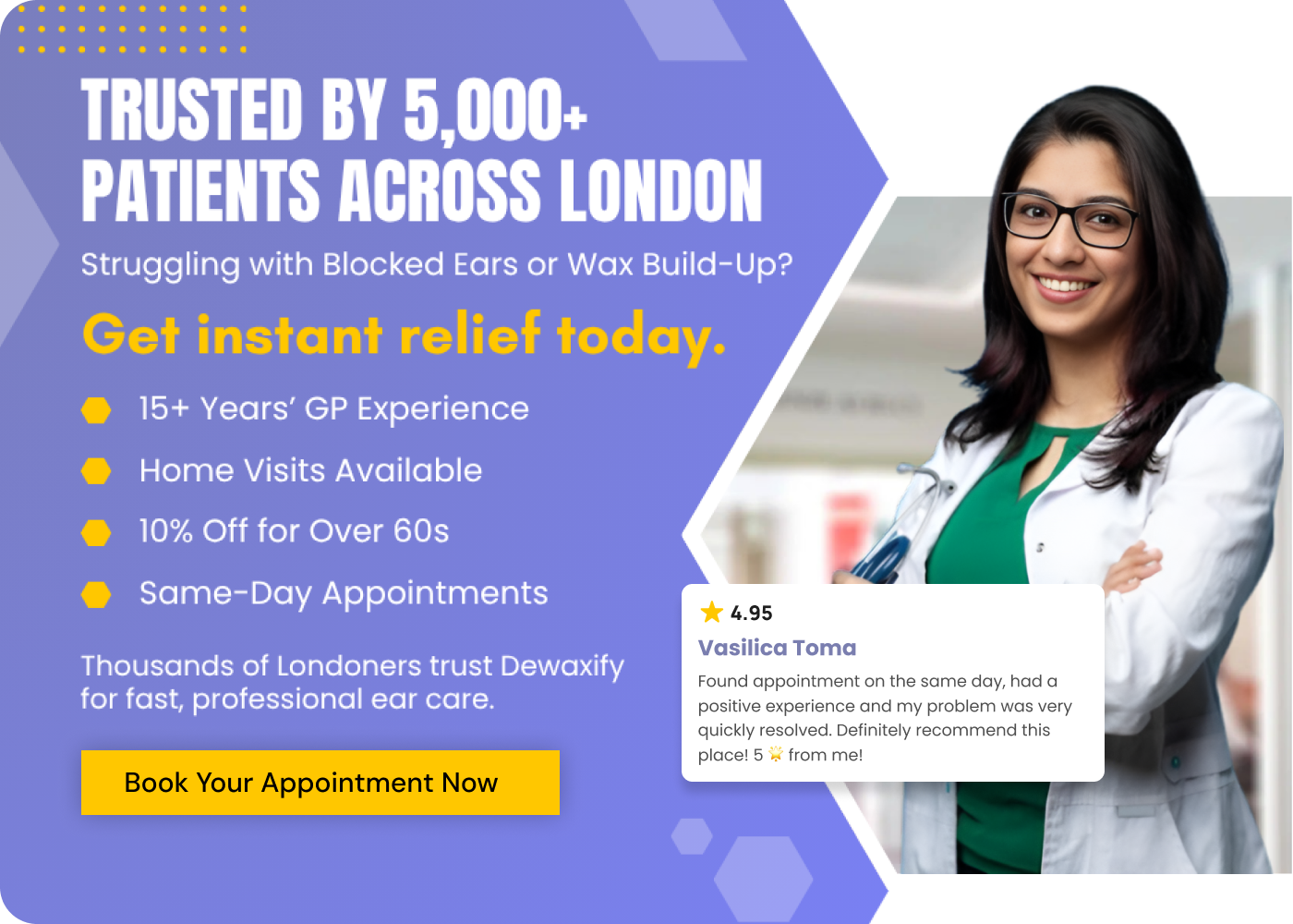 Vasilica Toma Found appointment on the same day,had a positive experience and my problem was very quickly resolved. Definitely recommend this place! 5 🌟 from me! Emanuil Minev this is my second time using Dewaxify and i must say its wonderful. ive had really plugged up ears and could hardly hear. once my ears were unblocked it was a whole new experience out in the world. couldnt recommend it more for anyone struggling with wax build-up problems. AP Developments Very good customer service. Fast and efficient. Seen same day shortly after calling up. Omar Mohamed Absolutely amazing service, instant relief would definitely recommend. Kerry Roche Absolutely brilliant the ladies were very friendly and welcoming and going from not being able to hear to hearing everything is amazing will definitely refer friends and family Olga Swierczynska Bylam dzisiaj pierwszy raz na Redbridge.mam doświadczenie w innych punktach przez 4 lata jeśli chodzi o czyszczenie uszu.uwiezcie jeszcze tak dokladnie niegdy nie miałam wyczyszczone .80. F ale warto wydać te pieniądze.Mlodziutka dziewczyna pomocna dokładna i delikatna.Naprawde polecam.Milego dnia Jeniffer Had a lovely experience at this clinic! Sita was absolutely lovely & reassuring during the whole process, and made me feel a lot more at ease! 100% recommend! Lauren Fernandes I’ve been going to Dewaxify for over a year or so and it’s the best place to get your ears cleaned! Sita is so gentle and always makes sure you’re feeling comfortable. She’s also been super understanding when I had a blocked ear and was able to make a quick emergency appointment! Simran Wadhwani Sita is absolutely brilliant and so informative when consulting. Always gentle and understanding during the appointment. I always come back for a good clear out when needed and receive tips from Sita on how best to look after our ears. Definitely recommend!Google rating score: 4.9 of 5, based on 240 reviews
